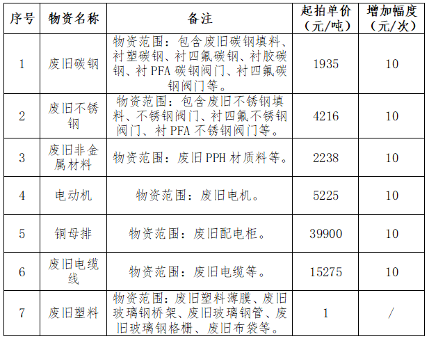 該標(biāo)的為整體拍賣(mài),以序號(hào)1(廢舊碳鋼)起拍單價(jià)1935元/噸進(jìn)行競(jìng)價(jià),采取增價(jià)方式競(jìng)拍,每次每噸加價(jià)10元,上不封頂;序號(hào)1(廢舊碳鋼)每增加10元/噸,序號(hào)2-6廢舊物資同步增加10元/噸。序號(hào)7(廢舊塑料)以起拍價(jià)隨附買(mǎi)受,結(jié)算數(shù)量以交付時(shí)實(shí)際過(guò)磅數(shù)量為準(zhǔn)。