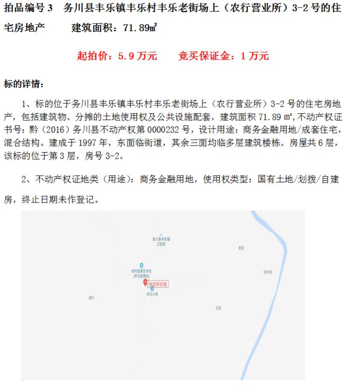 三、務(wù)川縣豐樂(lè)鎮(zhèn)豐樂(lè)村豐樂(lè)老街場(chǎng)上(農(nóng)行營(yíng)業(yè)所)3-2號(hào)的住宅房地產(chǎn)(建筑面積71.89㎡);