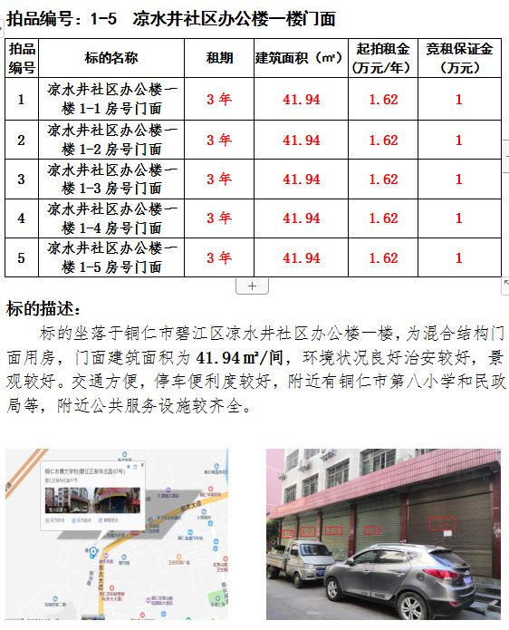 1、涼水井社區(qū)辦公樓一樓門面5間1-1、1-2、 1-3、 1-4、 1-5)3年租賃權(quán)(建筑面積:41.94㎡/間);起拍租金單價(jià)(每間):1.62萬元/年;競(jìng)租保證金(每間):1萬元;
