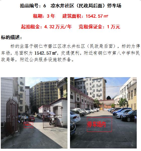 2、涼水井社區(qū)(民政局后面)停車場(chǎng)3年租賃權(quán)(建筑面積:1542.57㎡);起拍租金:4.32萬元/年;競(jìng)租保證金:1萬元;