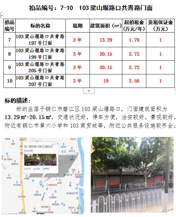 3、103梁山堰路口門面四間3年租賃權(quán)(建筑面積:13.29㎡-20.15㎡);起拍租金單價(jià):1.79萬元/年-2.72萬元/年;競(jìng)租保證金:1萬元;