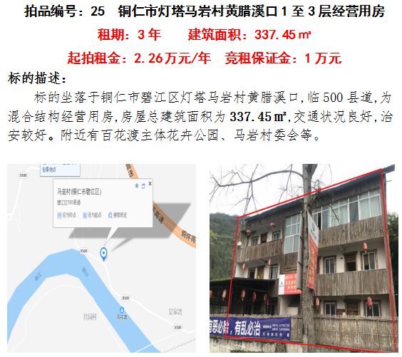 6、銅仁市碧江區(qū)燈塔馬巖村黃臘溪口1-3層經(jīng)營(yíng)房3年租賃權(quán)(建筑面積:337.45㎡);起拍租金單價(jià):2.26萬元/年;競(jìng)租保證金:1萬元;