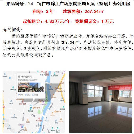 5、銅仁市錦江廣場(chǎng)原就業(yè)局第五樓辦公用房3年租賃權(quán)(建筑面積:267.24㎡);起拍租金單價(jià):4.82萬元/年;競(jìng)租保證金:1萬元;