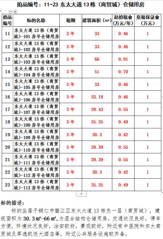 4、東太大道13棟(商貿(mào)城)倉儲(chǔ)(13間)3年租賃權(quán)(建筑面積30.3㎡-66㎡/間);起拍租金單價(jià)(每間):0.42萬元/年-0.91萬元/年;競(jìng)租保證金(每間):1萬元;