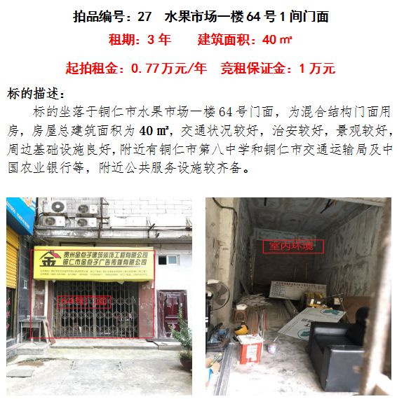 8、銅仁市水果市場(chǎng)一樓64號(hào)門面3年租賃權(quán)(建筑面積:40㎡);起拍租金單價(jià):0.77萬元/年;競(jìng)租保證金:1萬元;