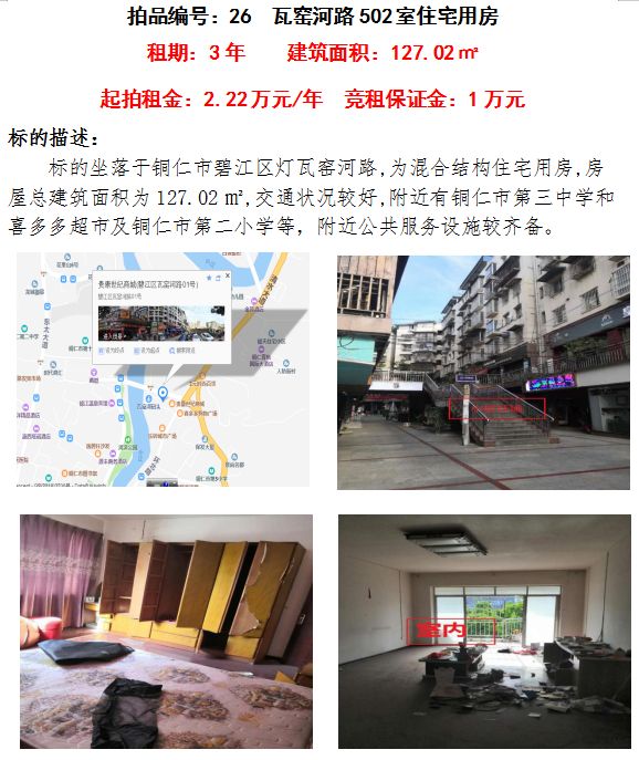 7、銅仁市碧江區(qū)瓦窯河路502室住宅用房3年租賃權(quán)(建筑面積:127.02㎡);起拍租金單價(jià):2.22萬元/年;競(jìng)租保證金:1萬元;