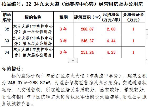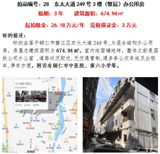 10、銅仁市碧江區(qū)東太大道249號(hào)辦公室3年租賃權(quán)(建筑面積:674.94㎡);起拍租金單價(jià):26.18萬元/年;競(jìng)租保證金:3萬元;