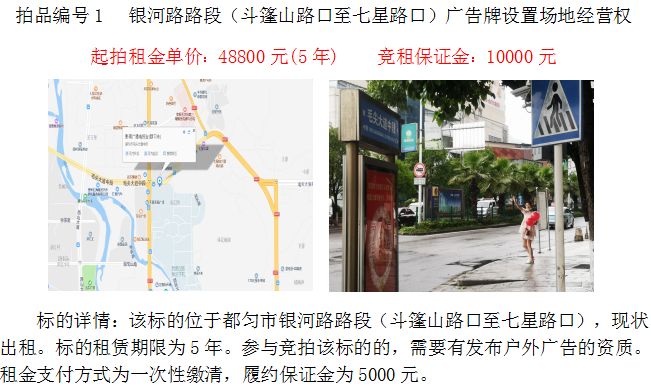 3、都勻市銀河路路段(斗篷山路口至七星路口)廣告牌設(shè)置場(chǎng)地經(jīng)營(yíng)權(quán)5年租賃權(quán)。